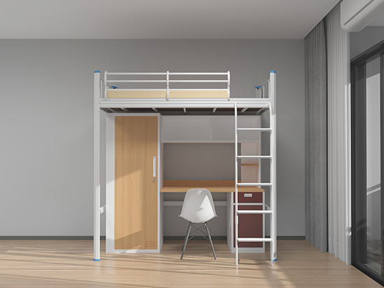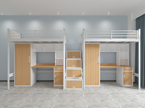 图三中,这是一个连体的铁架床,也是一个公寓床,一个带有柜子的床,不仅,它有衣柜,另外,还设计了抽屉、电脑桌柜以及楼梯柜,这样,存放东西的地方就更多了,将可利用的空间都利用了起来,而这样的一个铁架床,会经常被用到一些单位宿舍和教师宿舍里!