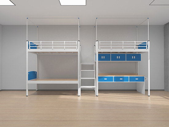 图二,这是一个单体的铁架床,也有人叫它公寓床,它只不过是一个上床下桌,上边是一个床位,下铺则是一个带有桌柜的家具,不仅,有一个地方可以睡觉,它的下铺则有一个衣柜和桌子,可以存放衣物和摆放生活用品,一般家用或单位宿舍都会采用这样的床。