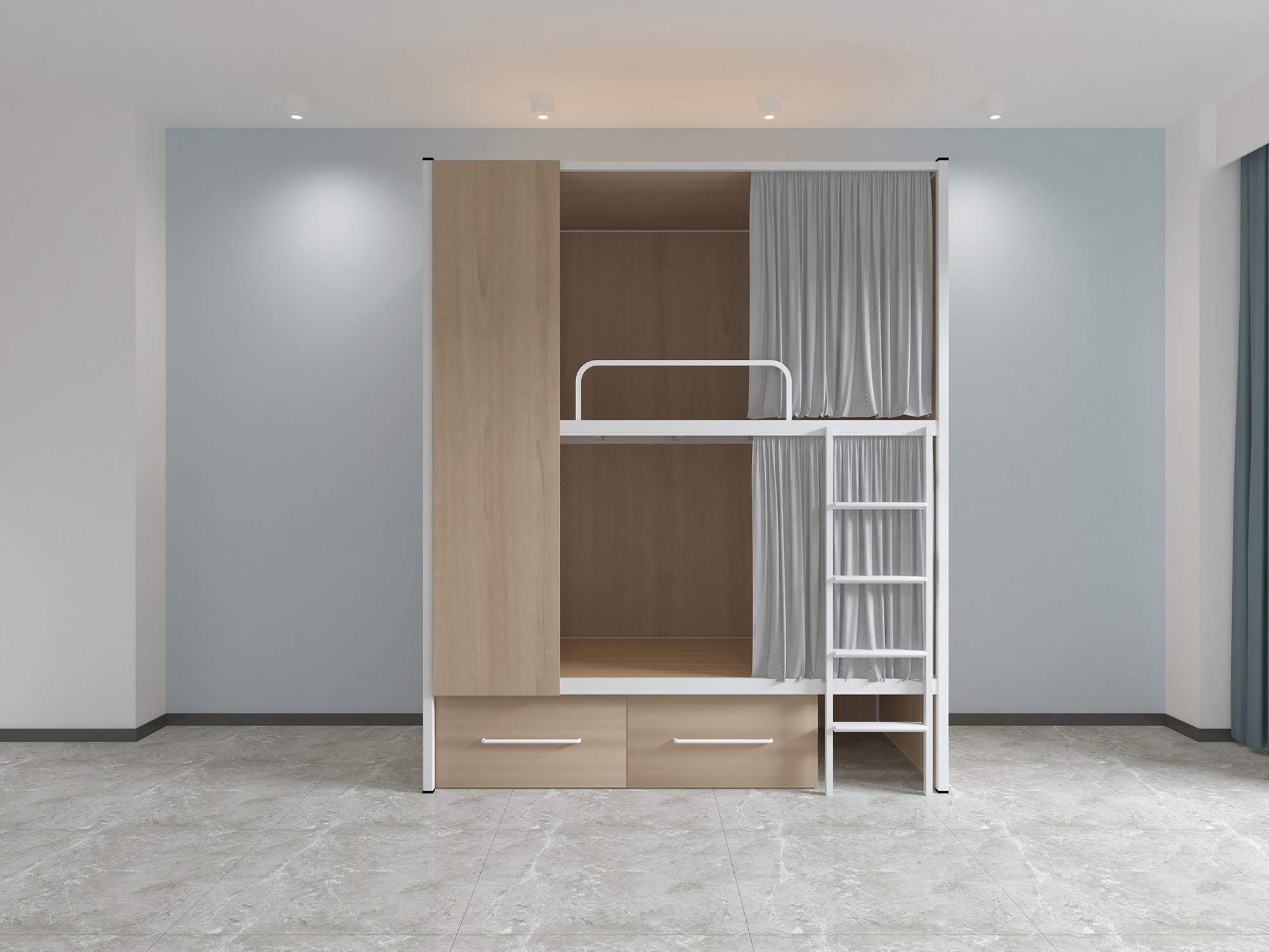 产品介绍:松山湖周边双层床厂家参数4460*970*1800mm1、床边立柱: 采用冷轧钢板,经特制成型线轧制而成,其立面为V型,立柱正面为斜边形设计,起到防撞